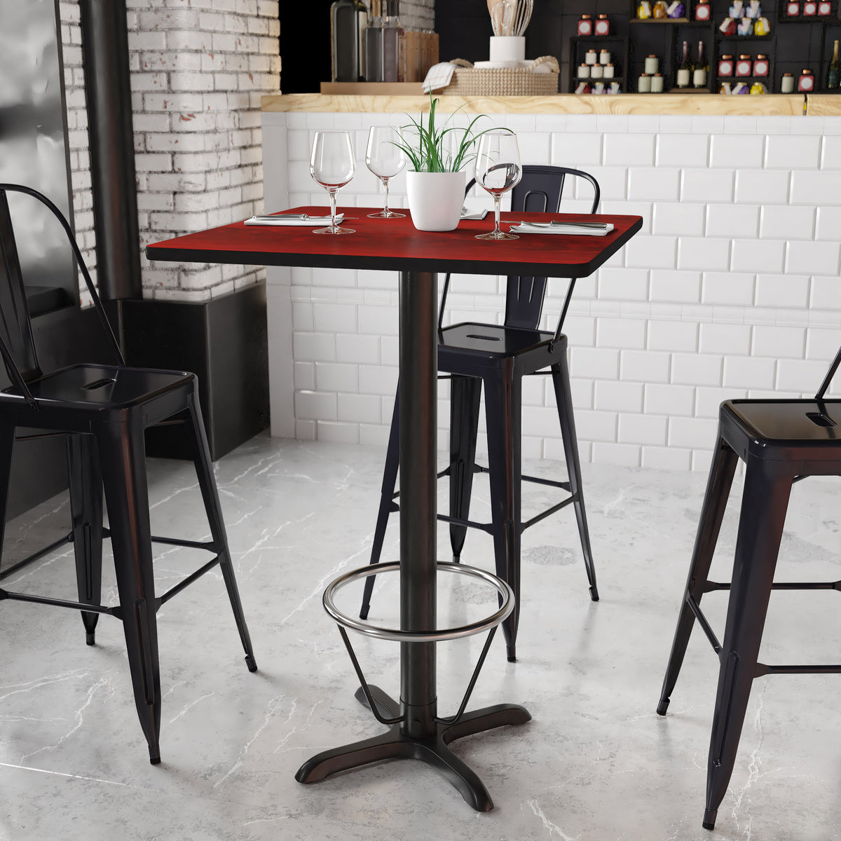 This set is designed for commercial use to withstand the daily rigors in the hospitality industry. This set will also make a great option for your home as a dining table or in the rec room. The reversible top allows you to choose your color of choice and then affix to the base. Surface is heat, scratch and moisture resistant. Use a mild detergent and water, dry clean to keep your tables spotless. The convenient foot rest is the perfect accessory for a bar table, especially in the hospitality industry.