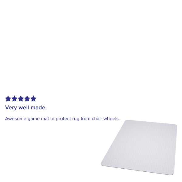 Chair mats are an essential component when furnishing your work or home office. Purchasing a chair mat is a worthwhile investment for assurance that your floors will be protected and are ergonomically beneficial in preventing leg fatigue. Not only do they protect your floors, chair mats offer personal safety with ease of mobility and provide a clean appearance. This carpet chair mat features a scuff and slip resistant textured top and small studded anchors on back to properly grip carpet.