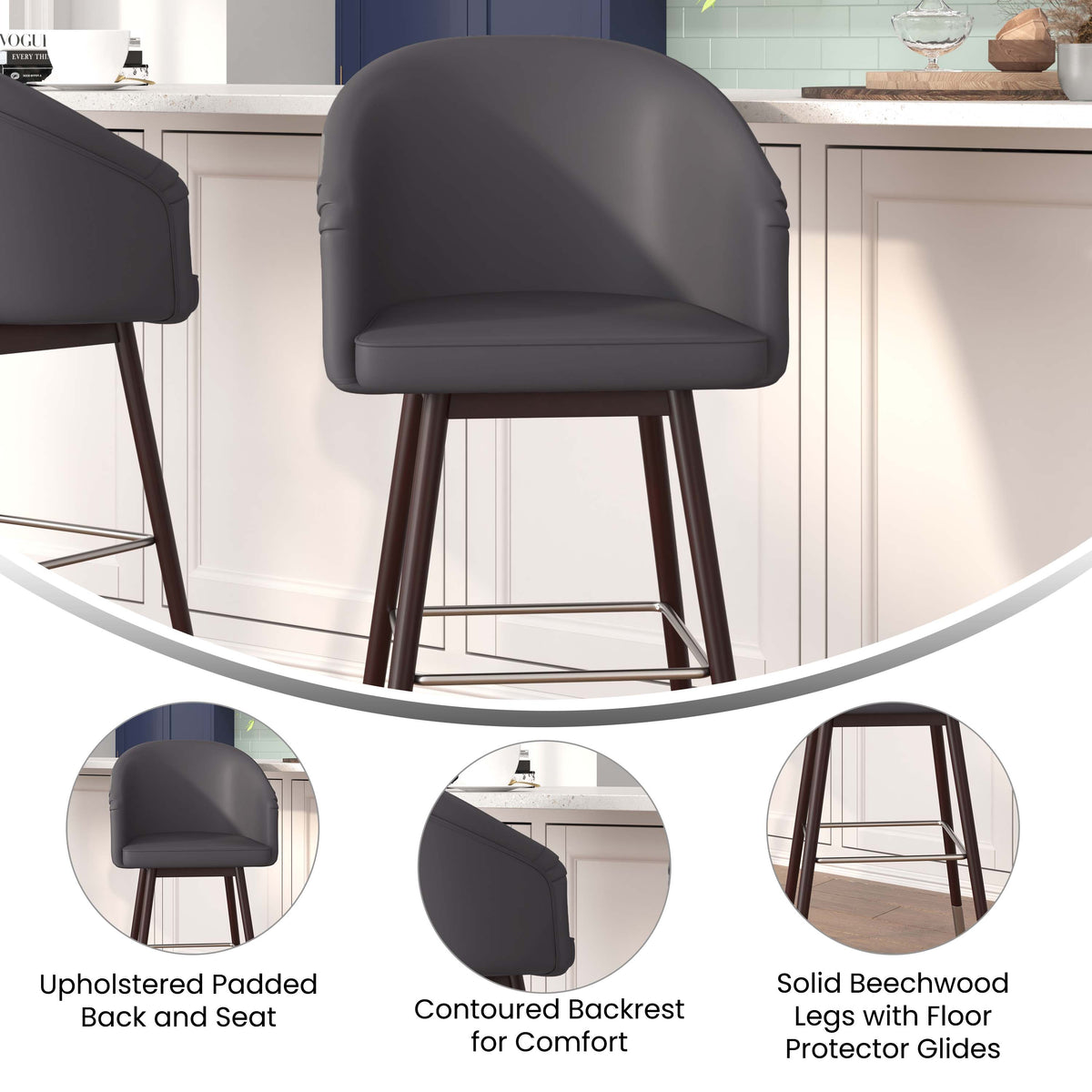 Great style paired with superior strength and durability make this bar stool a must-have for both business and home environments. Solid beechwood legs paired with powder coated steel bracing that doubles as a footrest allow this upholstered stool to hold up to 300 lbs. static weight. Floor protector glides keep your hard flooring surfaces free from damage and assembly takes less than 30 minutes with the included tools and instructions. Wipe with a dry cloth to keep your new bar height chairs looking brand new.