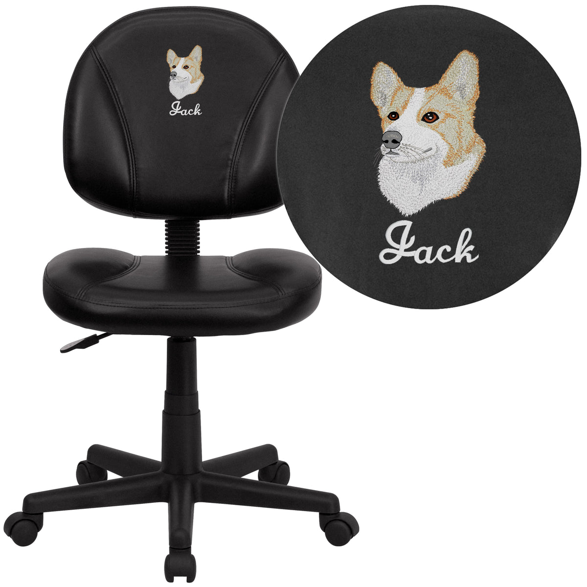 This stylish entry level computer chair features soft leather upholstery and sturdy nylon loop arms. The versatility of a task chair can easily transition from a receptionist's desk to the training room. A mid-back office chair offers support to the mid-to-upper back region. Chair easily swivels 360 degrees to get the maximum use of your workspace without strain. The pneumatic adjustment lever will allow you to easily adjust the seat to your desired height. Personalize this chair with custom text or a logo to show off your individual style or company design.